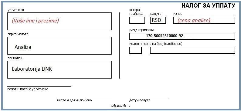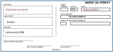 Poređenje potencijalnog oca i jednog deteta 26.000Svaka dodatna osoba (dete, na primer) 8.000Doplata za rezultat u roku od jednog radnog dana 10.000